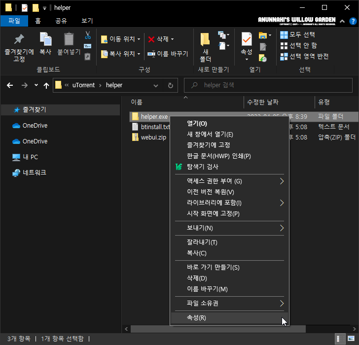 helper 폴더의 'helper.exe' 파일을 삭제한 후 새 폴더를 생성하고 이름을 'helper.exe'로 변경한 다음, 마우스 오른쪽 버튼을 눌러 '속성(R)'을 선택 합니다.
