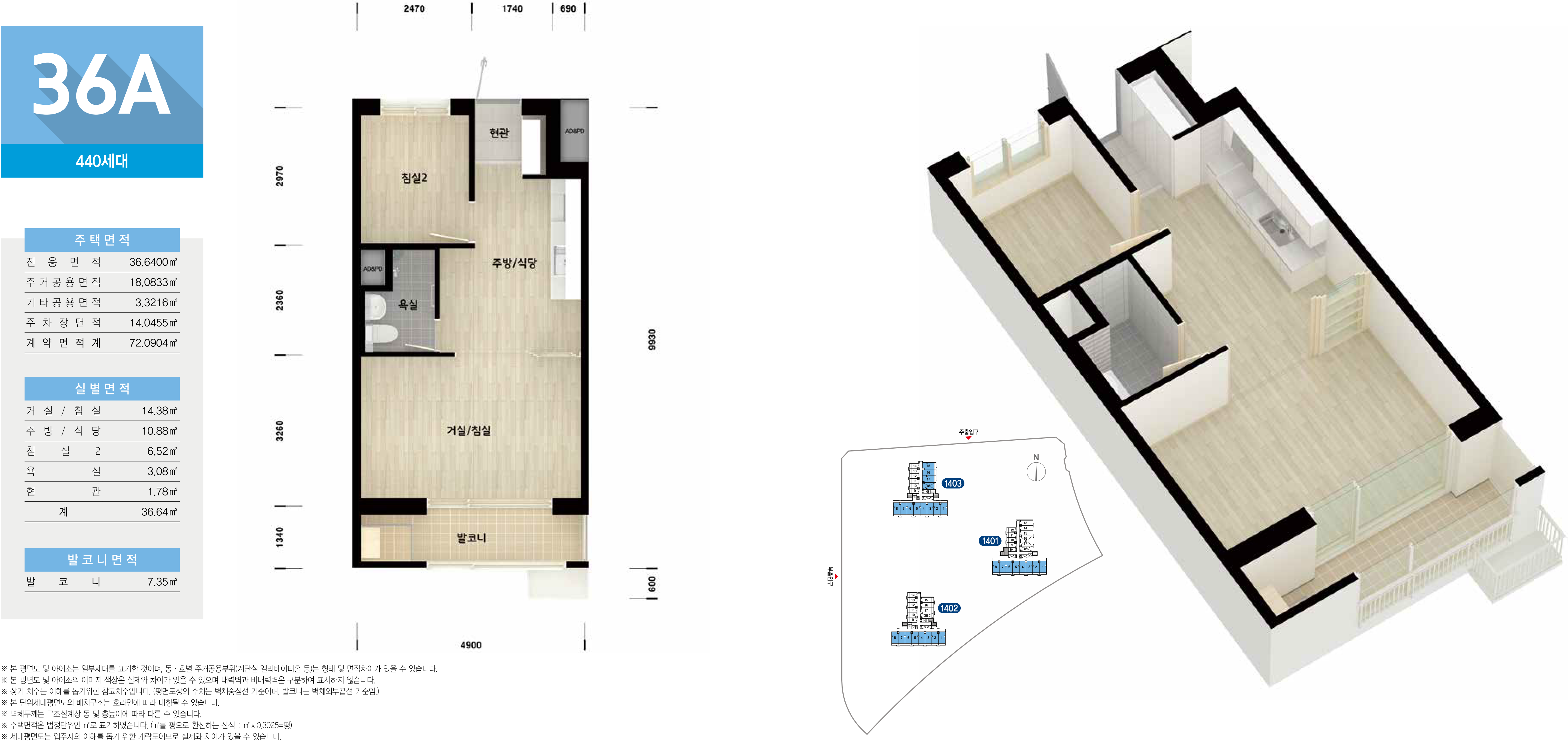 인천서창2지구 14블록 행복주택 인천서창 LH14단지 아파트 전용면적 36㎡의 36A형은서비스 면적으로 제공되는 주거공용 면적을 포함하여 舊, 평형으로 환산하면 약 16.554평으로, 침실 1개 외에 주방/식당과 거실/침실이 미닫이 문으로 분리되어 있고, 욕실과 실외기 설치 공간이 외부에 있는 발코니 등으로 구성되어 있는 1베이 구조입니다.
