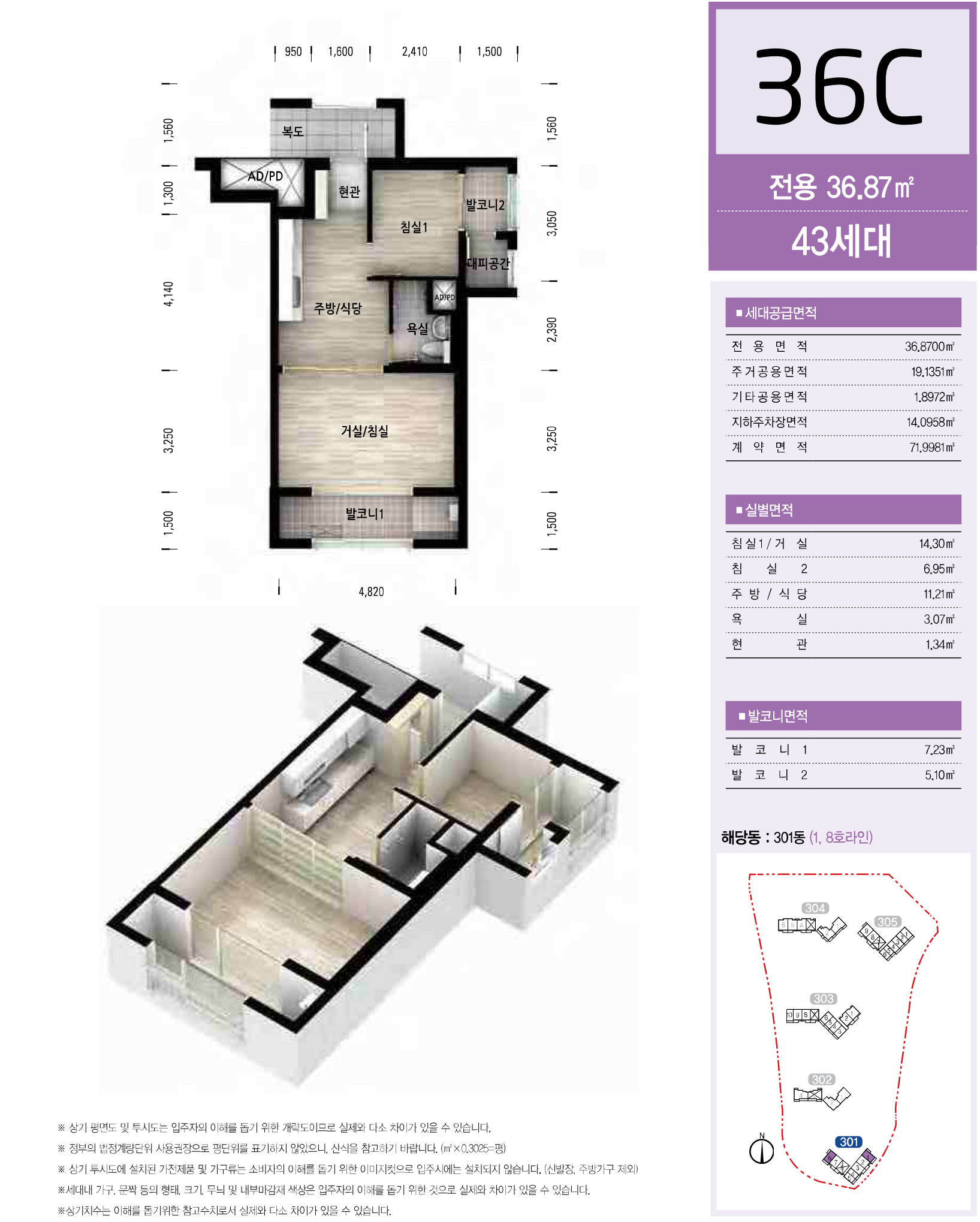 서울서초보금자리주택지구 A3블록 LH 서초3단지 아파트 국민임대주택 전용면적 36㎡의 36C형은 서비스 면적으로 제공되는 주거공용 면적에 추가 발코니 면적을 포함하여 舊, 평형으로 환산하면 약 18.484평으로, 침실 1개 외에 주방/식당과 거실/침실이 미닫이 문으로 분리 되어 있고, 욕실과 실외기 설치 공간이 내부에 있는 발코니 2개, 대피공간 등으로 구성되어 있는 타워형 구조입니다.