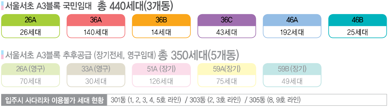 LH공사에서 공급하는 서울서초보금자리주택지구 A3블록 LH 서초3단지는 서울특별시 서초구 양재대로2길 34 [㉾06768] (舊, 지번주소: 서울특별시 서초구 우면동 784번지)에 위치해 있는 지역난방 방식의 아파트 단지로, 국민임대주택 440세대와 장기전세주택 250세대, 영구임대주택 100세대 등 총 790세대가 2013년 12월에 입주가 시작 되었습니다. 한국토지주택공사에서 국민임대주택으로 공급하는 서초보금자리 A3블록 LH 서초3단지 아파트는 14층 ~ 25층 규모의 301동 ~ 305동 까지 5개동 중 전용면적 26㎡의 26A형 26세대와 36㎡의 36A형 140세대, 36B형 14세대와 36C형 43세대, 46㎡의 46A형 192세대와 46B형 25세대로 구성되어 있습니다.