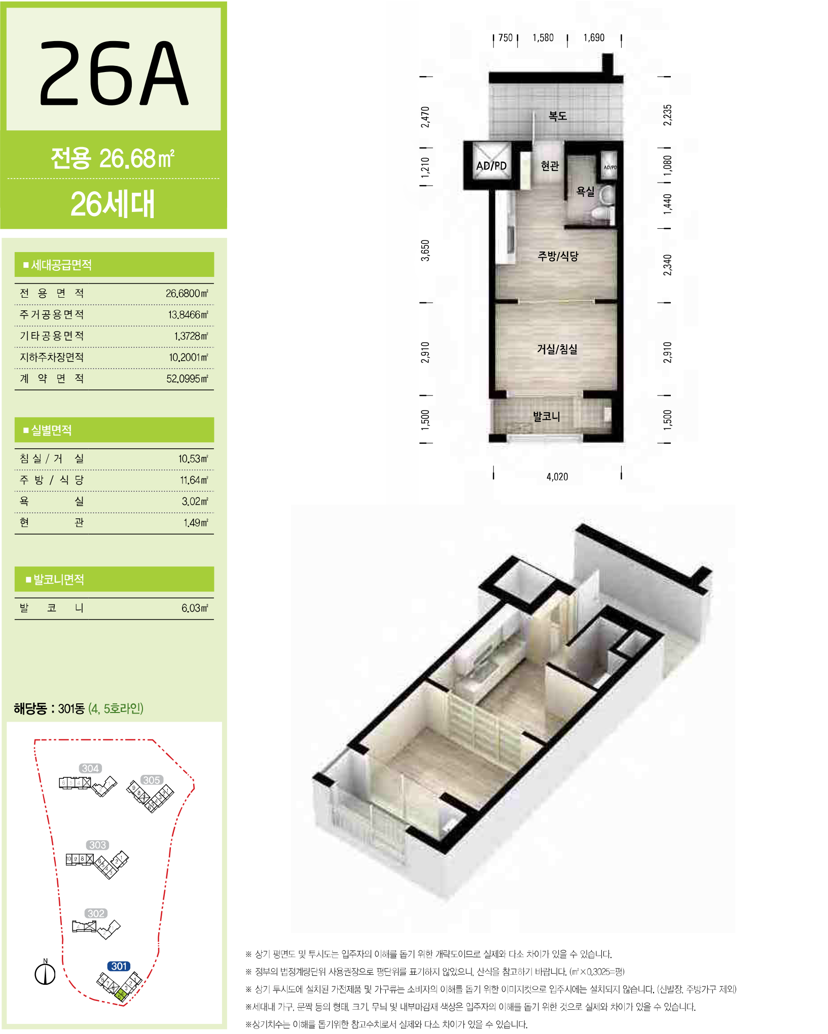 서울서초보금자리주택지구 A3블록 LH 서초3단지 아파트 국민임대주택 전용면적 26㎡의 26A형은 서비스 면적으로 제공되는 주거공용 면적을 포함하여 舊, 평형으로 환산하면 약 12.259평으로, 주방/식당과 거실/침실이 미닫이 문으로 분리 되어 있고, 욕실과 실외기 설치 공간이 내부에 있는 발코니 등으로 구성되어 있는 1베이 구조입니다.