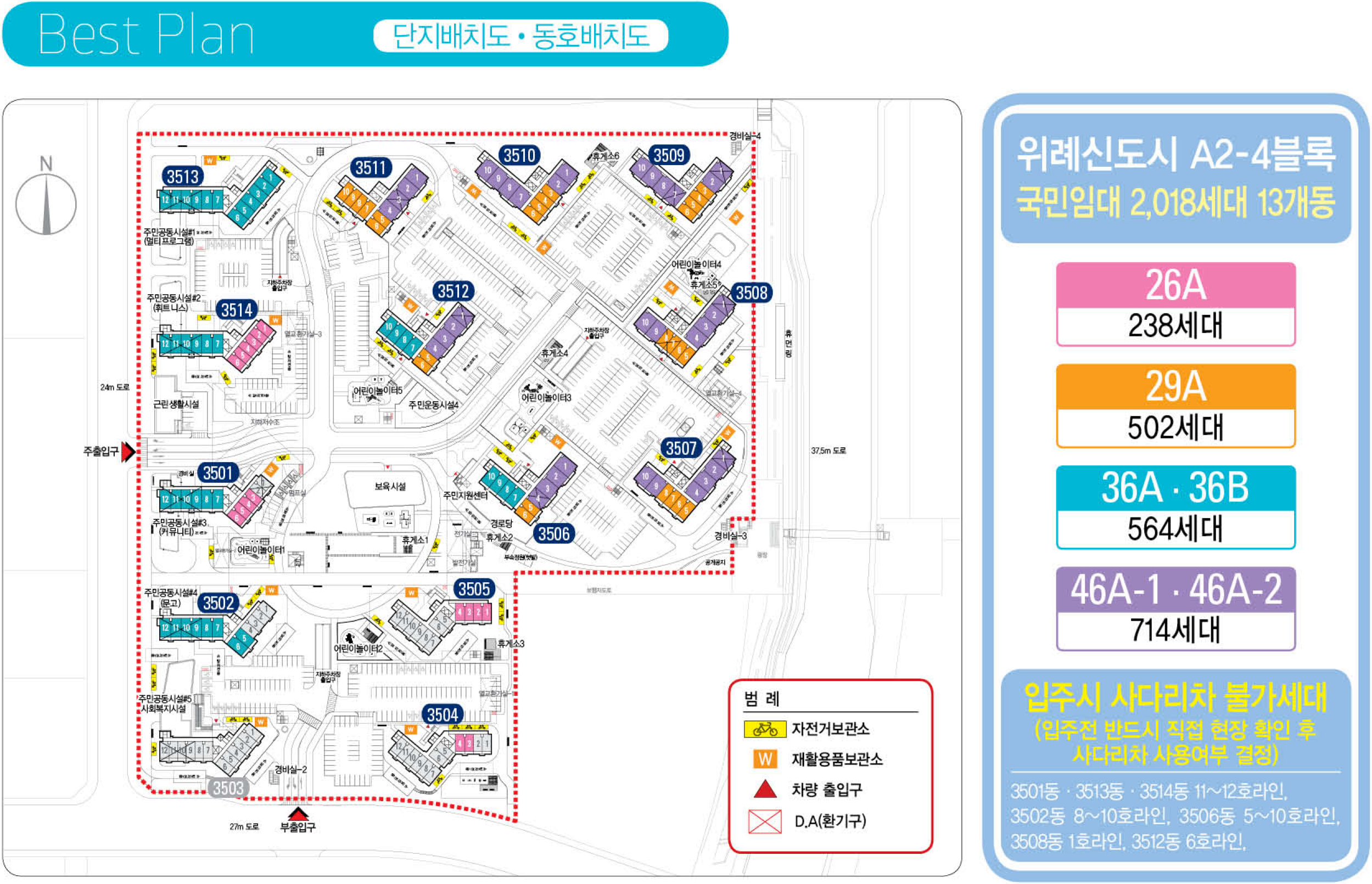 LH공사에서 공급하는 위례신도시 A2-4블록 위례 35단지는 경기도 성남시 수정구 위례광장로 311 [㉾13641] (舊, 지번주소: 경기도 성남시 수정구 창곡동 510번지)에 위치해 있는 지역난방 방식의 복도식 아파트 단지로, 국민임대주택 2,018세대와 영구임대주택 386세대 등 총 2,404세대가 2016년 06월에 입주가 시작 되었습니다. 한국토지주택공사에서 공급하는 위례신도시 A2-4블록 국민임대주택 위례 35단지 아파트는 13층 ~ 22층 규모의 3501동 ~ 3514동 까지 14개동 중 전용면적 26㎡의 26A형 238세대와 29㎡의 29A형 502세대, 36㎡의 36A형 564세대와 36B형 96세대, 46㎡의 46A1형 199세대와 46A2형 515세대로 구성되어 있습니다.