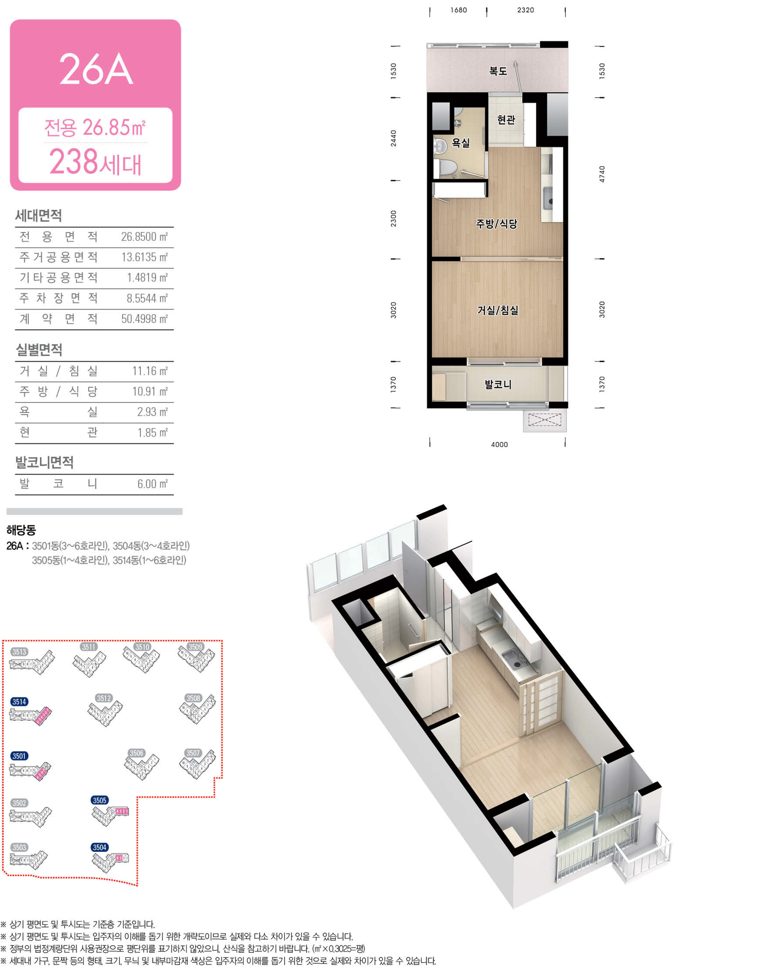 위례신도시 A2-4블록 국민임대주택 위례 35단지 아파트 전용면적 26㎡의 26A형은 서비스 면적으로 제공되는 주거공용 면적을 포함하여 舊, 평형으로 환산하면 약 13.640평으로, 주방/식당과 거실/침실이 미닫이문으로 분리되어 있고, 욕실과 반침장, 실외기 설치 공간이 외부에 있는 발코니 등으로 구성 있는 1베이 구조입니다.