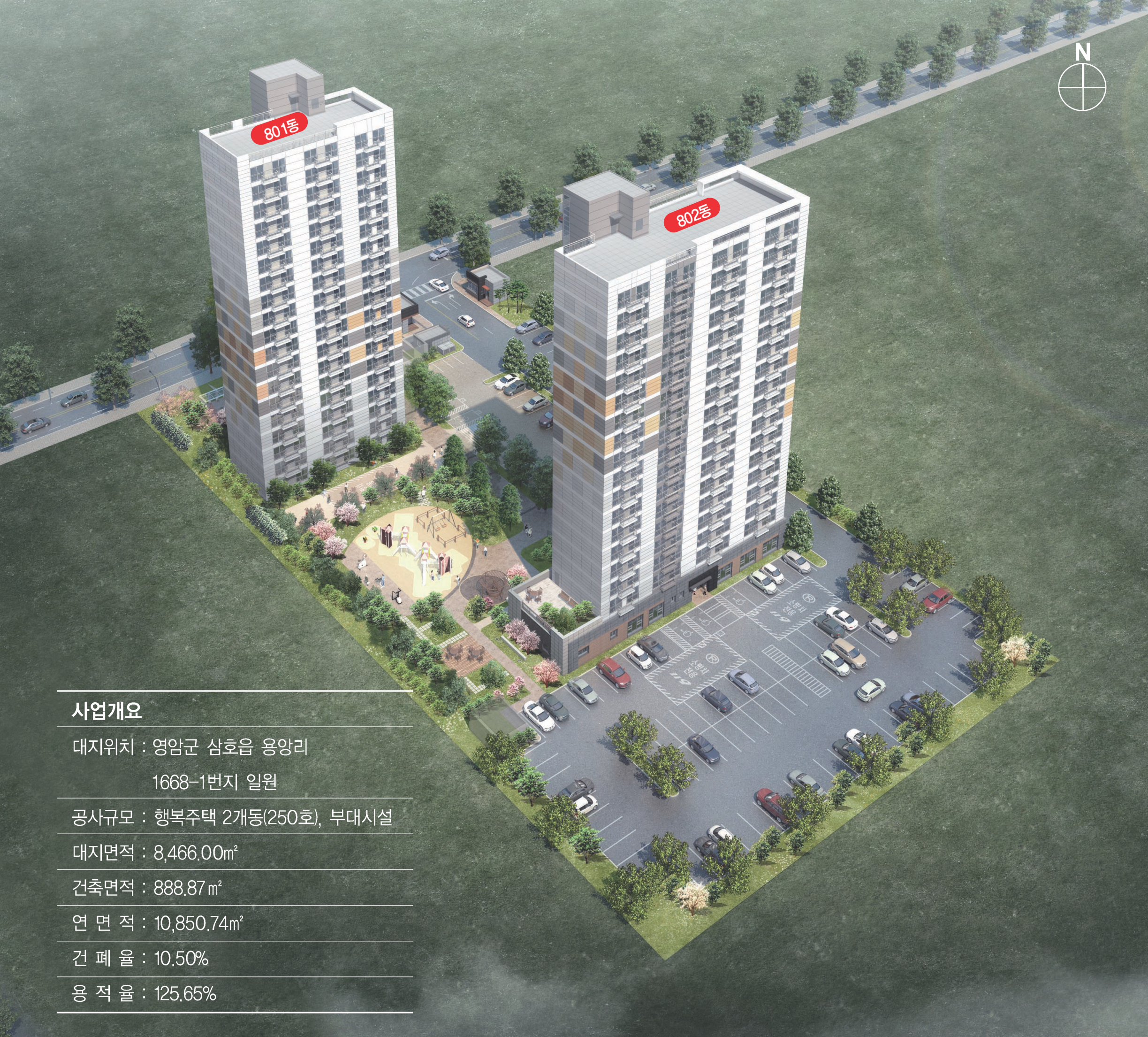 LH공사에서 공급하는 영암용앙 행복주택 영암용앙3 LH 아파트는 전라남도 영암군 삼호읍 대불주거6로 62 [㉾58455] (舊, 지번주소: 전라남도 영암군 삼호읍 용앙리 1668-1번지)에 위치해 있는 개별난난방 방식의 아파트 단지로, 2019년 11월에 입주가 시작되었습니다. 한국토지주택공사에서 공급하는 영암용앙 행복주택 영암용앙3 LH 아파트는 301동 ~ 302동 까지 2개동 전용면적 21㎡의 21A형 100세대와 주거약자용 주택인 21B형 6세대, 26㎡의 26A형 68세대와 주거약자용 주택인 26B형 8세대, 36㎡의 36형 68세대 등 총 250세대로 구성되어 있습니다.