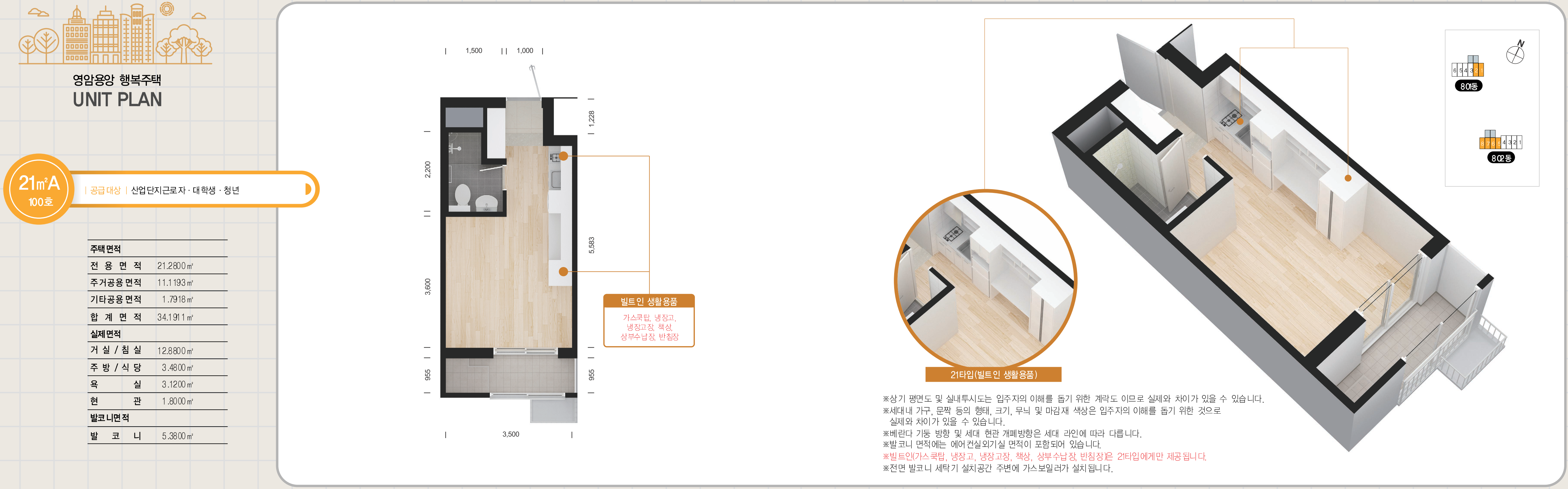 영암용앙 행복주택 영암용앙3 LH 아파트 전용면적 21㎡의 21B형은 서비스 면적으로 제공되는 주거공용 면적을 포함하여 舊, 평형으로 환산하면 약 9.777평으로, 주방/식당과 거실/침실이 일체형으로 되어 있고, 욕실과 실외기 설치 공간이 외부에 있는 발코니 등으로 구성되어 있는 1베이 원룸형 구조에 빌트인으로 2구형 가스쿡탑과 소형냉장고, 냉장고장과 식탁 겸용 책상, 오픈장식장 겸 책장과 붙박이장 등의 생활용품이 시공·설치되어 공급 됩니다.