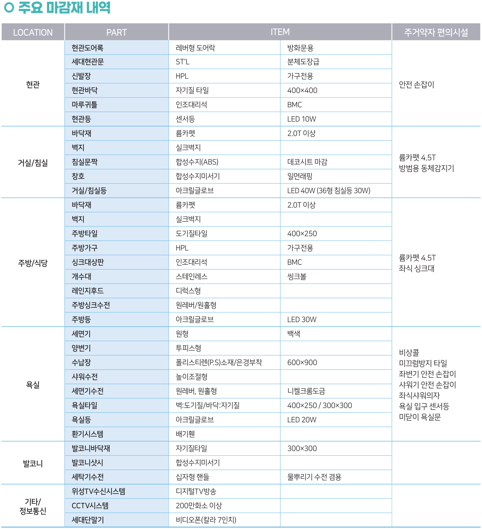 이와 함께 주거약자용 주택으로 2세대가 공급되는 26B형에는 「공공주택 업무처리지침」에 따라 현관과 욕실의 수직·수평 안전손잡이, 센서보행등과 응급 비상콜 및 동체감지기, 욕실의 높낮이 조절 좌식 샤워시설과 접이식 좌식의자, 미끄럼 방지 바닥재와 바닥단차 줄임, 욕실 출입문 규격 확대 및 포켓도어 시공 등 세대내 편의시설이 시공·설치되어 공급됩니다.