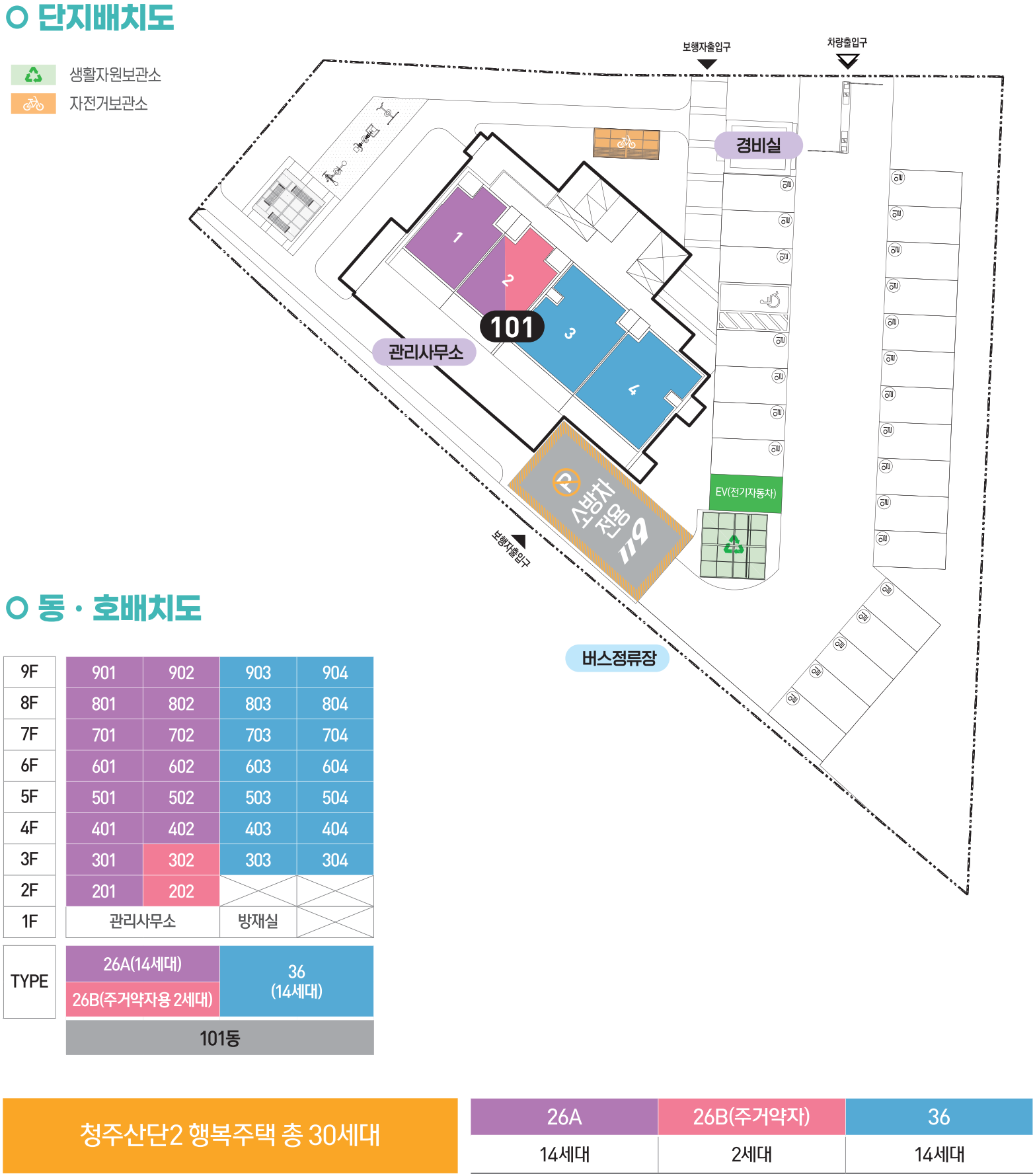 LH공사에서 산업단지형으로 공급하는 청주산단2 행복주택은 충청북도 청주시 흥덕구 공단로 58 [㉾28588] (舊, 지번주소: 충청북도 청주시 흥덕구 복대동 100-15번지)에 위치해 있는 개별난방 방식의 아파트 단지로, 2022년 12월에 입주가 시작되었습니다. 한국토지주택공사에서 산업단지형으로 공급하는 청주산단2 행복주택 아파트는 9층 규모의 101동 1개동 중 전용면적 26㎡의 26A형 14세대와 주거약자용 주택인 26B형 2세대, 36㎡의 36형 14세대 등 총 30세대로 구성되어 있습니다.