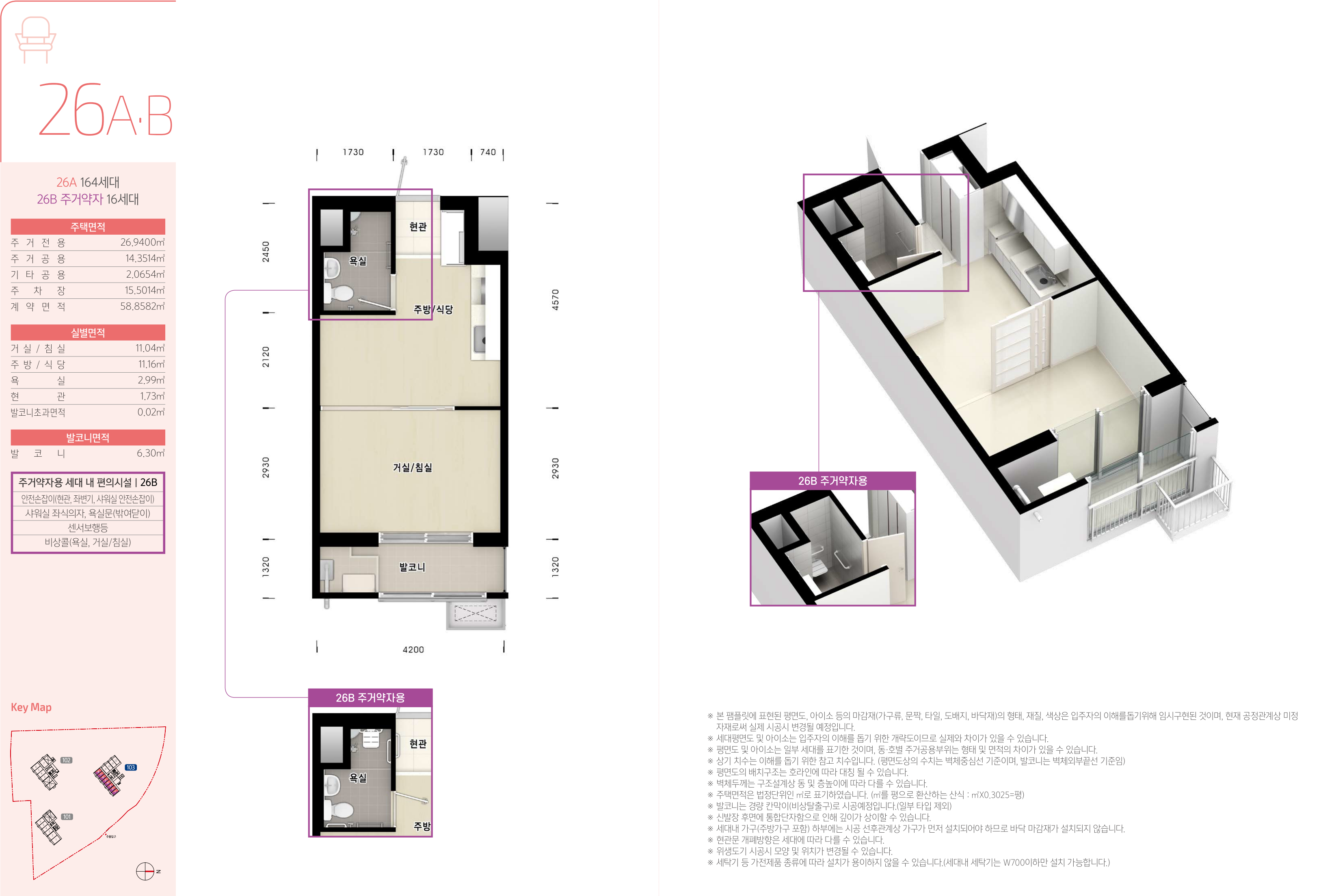 충주호암지구 A4-1블록 국민임대주택 LH 충주호암 1단지 아파트 전용면적 26㎡의 26A형과 주거약자용 주택인 26B형은 주방/식당과 거실/침실이 미닫이문으로 분리되어 있고, 욕실과 실외기 설치 공간이 외부에 있는 발코니 등으로 구성되어 있는 1베이 구조에 서비스 면적으로 제공되는 주거공용 면적을 포함하여 舊, 평형으로 환산하면 약 12.491평 입니다.