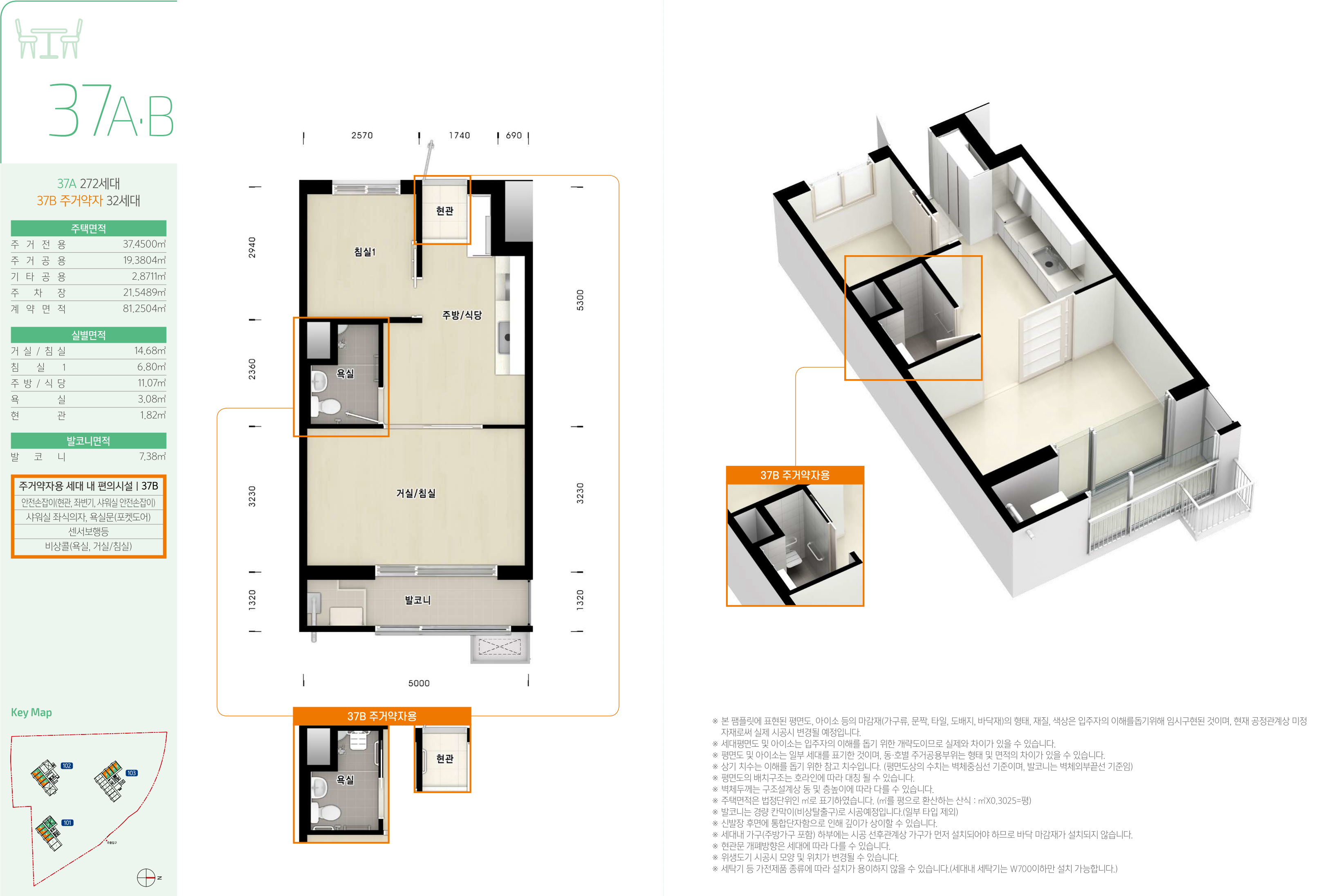 충주호암지구 A4-1블록 국민임대주택 LH 충주호암 1단지 아파트 전용면적 37㎡의 37A형과 주거약자용 주택인 37B형은 침실 1개 외에 주방/식당과 거실/침실이 미닫이문으로 분리되어 있고, 욕실과 실외기 설치 공간이 외부에 있는 발코니 등으로 구성되어 있는 1베이 구조에 서비스 면적으로 제공되는 주거공용 면적을 포함하여 舊, 평형으로 환산하면 약 17.191평 입니다.