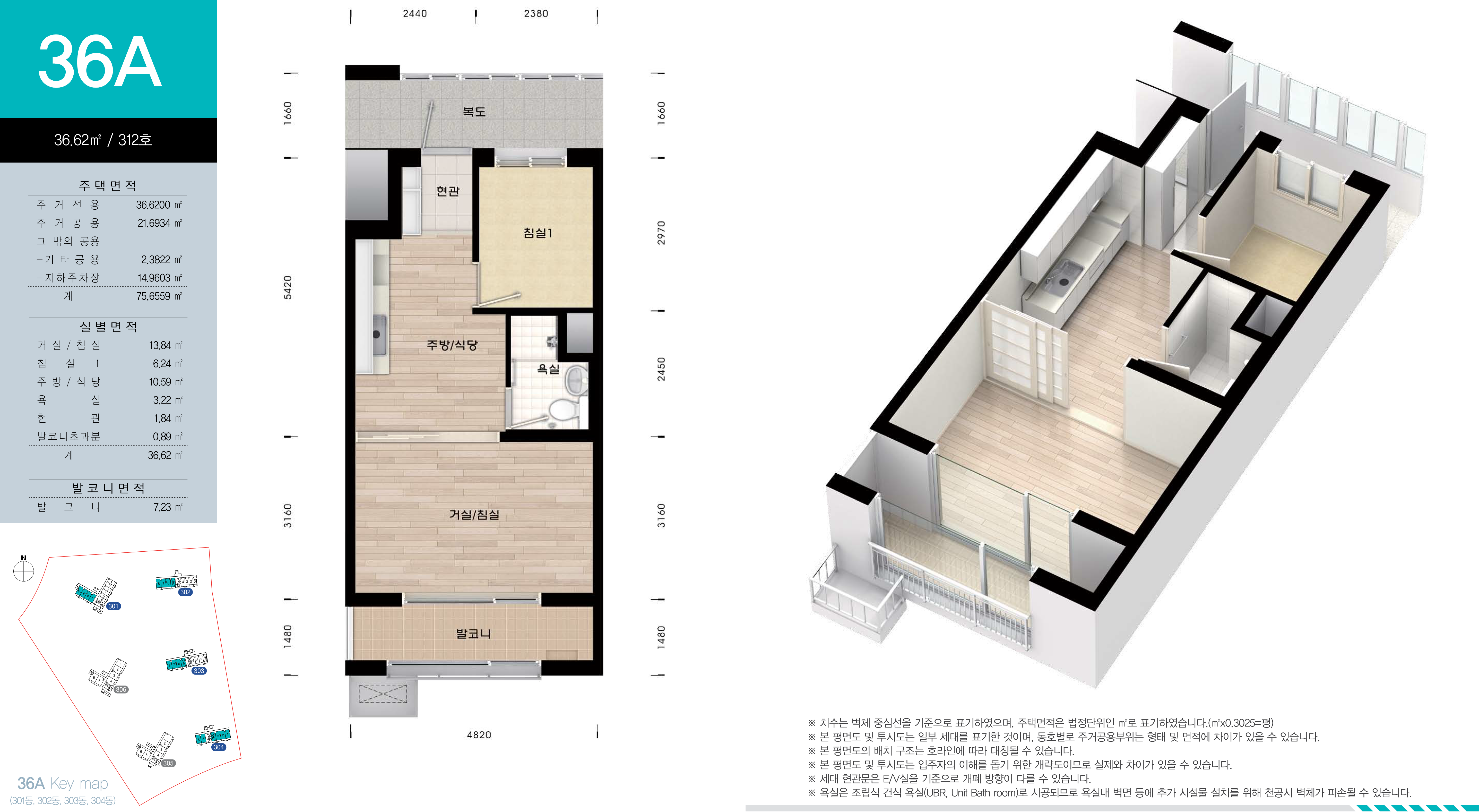 남양뉴타운 A3블록 국민임대주택 LH 화성남양 뉴타운 4단지 전용면적 36㎡의 36A형은 서비스 면적으로 제공되는 주거공용 면적을 포함하여 舊, 평형으로 환산하면 약 17.640평으로, 침실 1개 외에 주방/식당과 거실/침실이 미닫이문으로 분리되어 있고, 욕실과 실외기 설치 공간이 외부에 있는 발코니 등으로 구성되어 있는 1베이 구조 입니다.